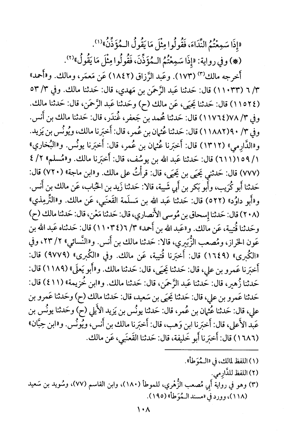 و «الدَّارِمي» (١٣١٢) قال: أخبرنا عثمان بن عمر، قال: أخبرنا يونس. و «البخاري» ١/ ١٥٩ (٦١١) قال: حدثنا عبد الله بن يوسف، قال: أخبرنا مالك. و «مسلم» ٢/ ٤ (٧٧٧) قال: حدثني يحيى بن يحيى، قال: قرأت على مالك. و «ابن ماجة» (٧٢٠) قال: حدثنا أَبو كُريب، وأَبو بكر بن أبي شيبة، قالا: حدثنا زيد بن الحُبَاب، عن مالك بن أنس. و «أَبو داود» (٥٢٢) قال: حدثنا عبد الله بن مَسلَمة القَعنَبي، عن مالك. و «التِّرمِذي» (٢٠٨) قال: حدثنا إسحاق بن موسى الأَنصاري، قال: حدثنا مَعْن، قال: حدثنا مالك (ح) وحدثنا قتيبة، عن مالك. و «عبد الله بن أحمد» ٣/ ٦ (١١٠٣٤) قال: حدثناه عبد الله بن عون الخراز، ومصعب الزُّبَيري، قالا: حدثنا مالك بن أنس. و «النَّسَائي» ٢/ ٢٣، وفي «الكبرى» (١٦٤٩) قال: أخبرنا قتيبة، عن مالك. وفي «الكبرى» (٩٧٧٩) قال: أخبرنا عَمرو بن علي، قال: حدثنا يحيى، قال: حدثنا مالك. و «أَبو يَعلى» (١١٨٩) قال: حدثنا زهير، قال: حدثنا عبد الرَّحمَن، قال: حدثنا مالك. و «ابن خزيمة» (٤١١) قال: حدثنا عَمرو بن علي، قال: حدثنا يحيى بن سعيد، قال: حدثنا مالك (ح) وحدثنا عَمرو بن علي، قال: حدثنا عثمان بن عمر، قال: حدثنا يونس بن يزيد الأيلي (ح) وحدثنا يونس بن عبد الأعلى، قال: أخبرنا ابن وهب، قال: أخبرنا مالك بن أنس، ويونس. و «ابن حِبَّان» (١٦٨٦) قال: أخبرنا أَبو خليفة، قال: حدثنا القَعنَبي، عن مالك.