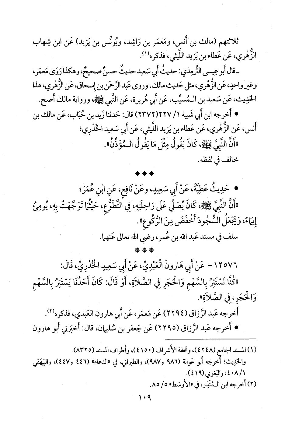 العَبدي، قال: قلتُ لأَبي سعيد الخُدْري: ما يَستُر المُصَلِّي؟ قال: مثل مُؤخِرَة الرَّحْل، والحَجَر يُجزئ ذلك، والسَّهم تَغرِزه بين يديك. «موقوفٌ».