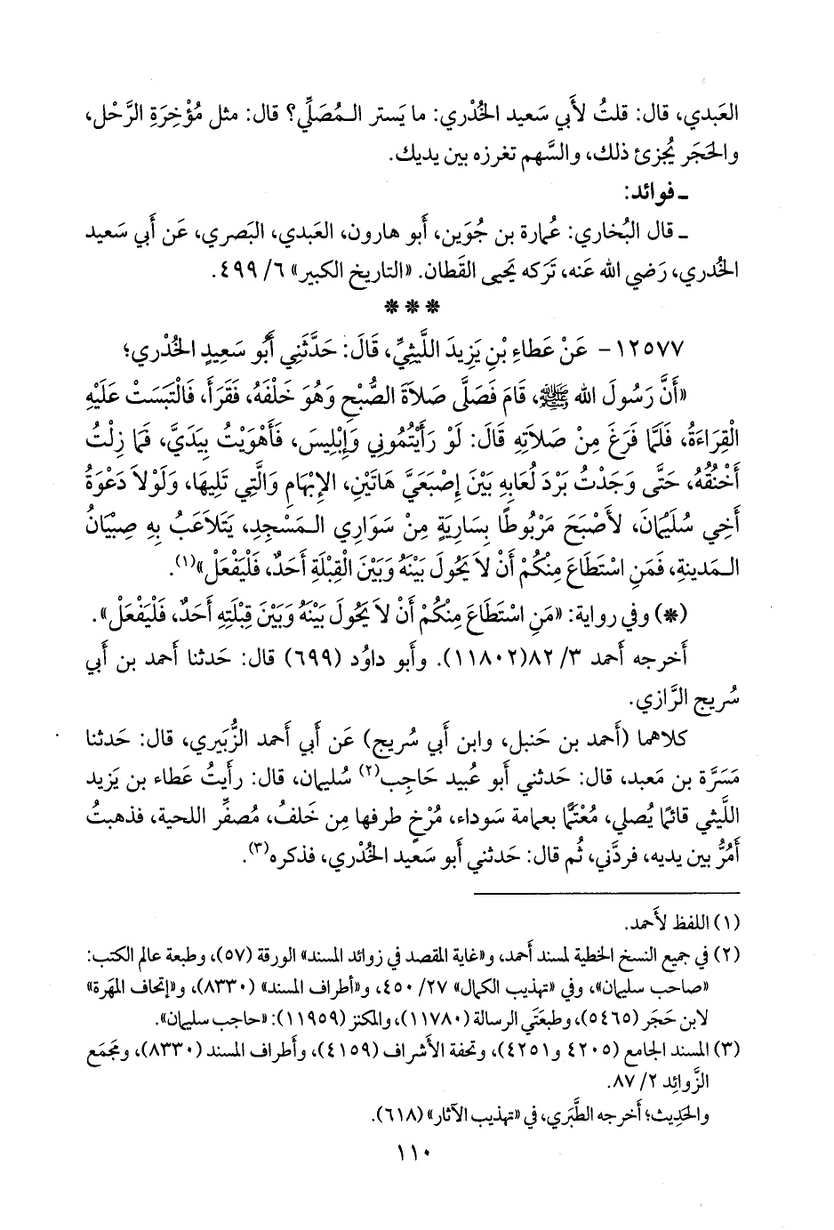 كلاهما (أَحمد بن حَنبل، وأحمد بن أَبي سُريج) عن أَبي أَحمد الزُّبَيري محمد بن عبد الله بن الزبير الأسدي، قال: حدثنا مَسَرَّة بن مَعبد، قال: حدثني أَبو عبيد حاجب (¬٢) سليمان، قال: رأيت عطاء بن يزيد الليثي قائمًا يصلي، معتما بعمامة سوداء، مرخ طرفها من خلفه، مصفر اللحية، فذهبت أمر بين يديه، فردني، ثم قال: حدثني أَبو سعيد الخُدْري، فذكره (¬٣).