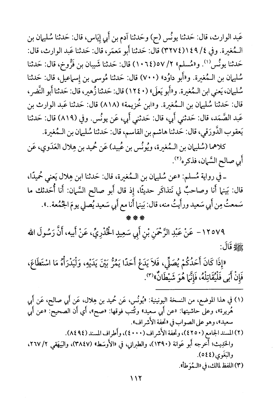 - وفي رواية: «عن عبد الرَّحمَن بن أبي سعيد الخُدْري، قال: بينا أَبو سعيد الخُدْري يصلي، إذ جاءه شاب يريد أن يمر قريبا من سترته، وأمير المدينة يومئذ مروان، قال: فدفعه أَبو سعيد حتى صرعه، قال: فذهب الفتى حتى دخل على مروان، فقال: هاهنا شيخ مجنون دفعني حتى صرعني، قال: هل تعرفه؟ قال: نعم، قال: وكانت الأنصار تدخل عليه يوم الجمعة، قال: فدخل عليه أَبو سعيد، فقال مروان للفتى: هل تعرفه؟ قال: نعم، هو هذا الشيخ، قال مروان للفتى: أتعرف من هذا؟ قال: لا، قال: هذا صاحب رسول الله صَلى الله عَليه وسَلم قال: فرحب به مروان وأدناه، حتى قعد قريبا من مجلسه، فقال له: إن هذا الفتى يذكر أنك دفعته حتى صرعته، قال: ما فعلت، فردها عليه، وهو يقول: إنما دفعت شيطانا، قال: ثم قال: سمعت رسول الله صَلى الله عَليه وسَلم يقول: إذا أراد أحد أن يمر بين يديك، وبين سترتك، فرده، فإن أبى فادفعه، فإن أبى فقاتله، فإنما هو شيطان» (¬٢).