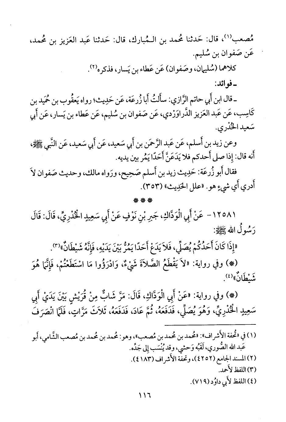 - وفي رواية: «عن أبي الوداك، قال: مر شاب من قريش بين يدي أبي سعيد الخُدْري، وهو يصلي، فدفعه، ثم عاد، فدفعه، ثلاث مرات، فلما انصرف