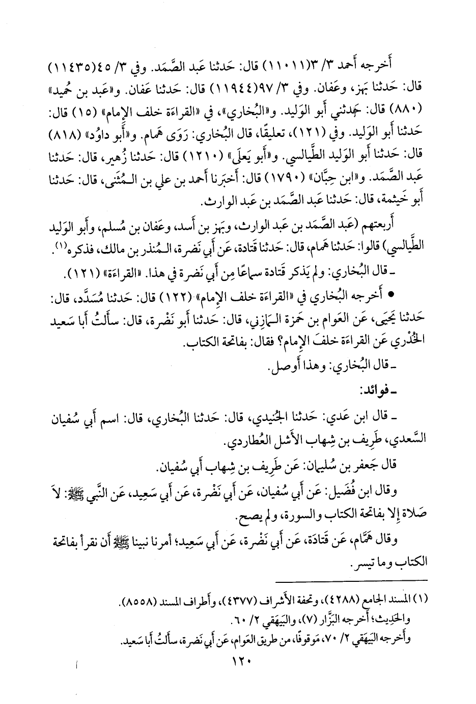قال البخاري: حدثني مُسدد، قال: حدثنا يحيى، عن عوام بن حمزة، قال: حدثنا أَبو نضرة، سألتُ أَبا سعيد الخُدْري عن القراءة خلف الإمام، قال: بفاتحة الكتاب.
