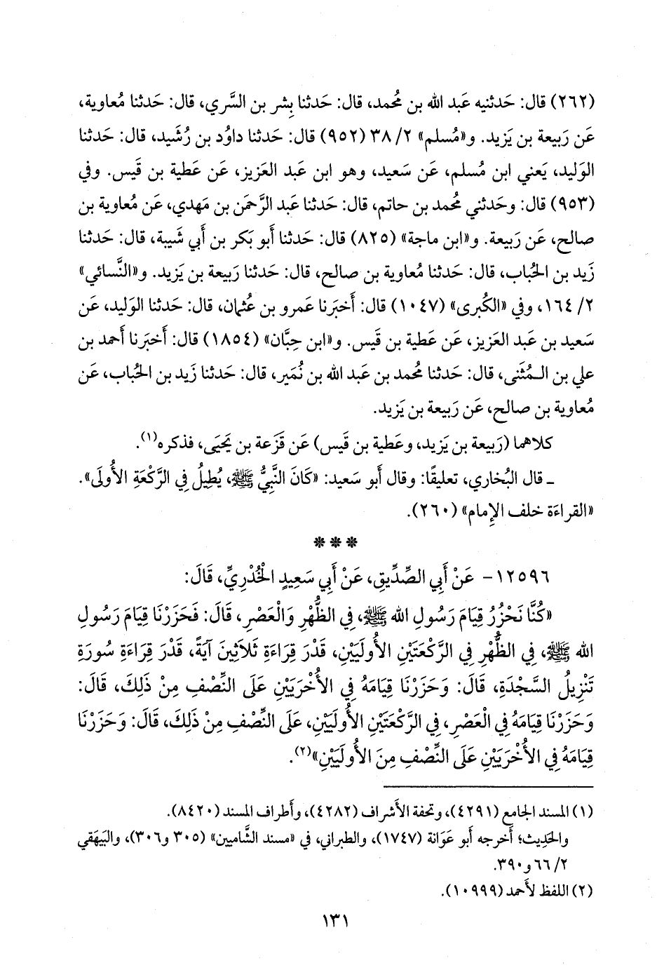 - وفي رواية: «كنا نحزر قيام رسول الله صَلى الله عَليه وسَلم في الظهر والعصر، فحزرنا قيامه في الظهر، في الركعتين الأوليين، قدر ثلاثين آية، وحزرنا قيامه في الركعتين الأخريين على النصف من ذلك، وحزرنا قيامه في الركعتين الأوليين من العصر على قدر الأخريين من الظهر، وحزرنا قيامه في الأخريين من العصر على النصف من ذلك» (¬٢).