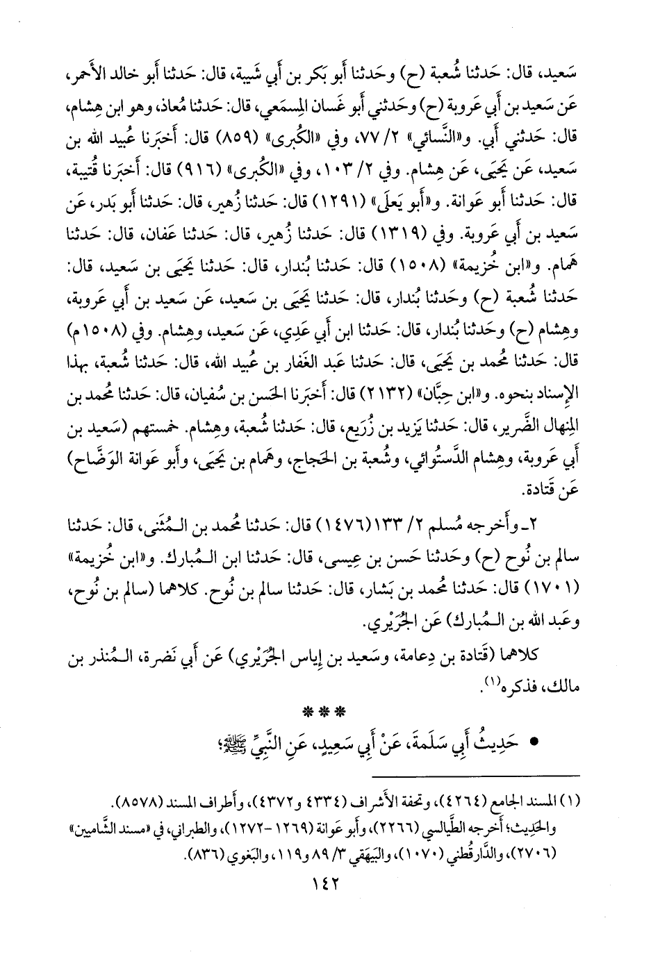 و «النَّسَائي» ٢/ ٧٧، وفي «الكبرى» (٨٥٩) قال: أخبرنا عُبيد الله بن سعيد، عن يحيى، عن هشام. وفي ٢/ ١٠٣، وفي «الكبرى» (٩١٦) قال: أخبرنا قتيبة، قال: حدثنا أَبو عَوانة. و «أَبو يَعلى» (١٢٩١) قال: حدثنا زهير، قال: حدثنا أَبو بدر، عن سعيد بن أبي عَروبَة. وفي (١٣١٩) قال: حدثنا زهير، قال: حدثنا عفان، قال: حدثنا همام. و «ابن خزيمة» (١٥٠٨) قال: حدثنا بُندَار، قال: حدثنا يحيى بن سعيد، قال: حدثنا شعبة (ح) وحدثنا بُندَار، قال: حدثنا يحيى بن سعيد، عن سعيد بن أبي عَروبَة، وهشام (ح) وحدثنا بُندَار، قال: حدثنا ابن أَبي عَدي، عن سعيد، وهشام. وفي (١٥٠٨ م) قال: حدثنا محمد بن يحيى، قال: حدثنا عبد الغفار بن عُبيد الله، قال: حدثنا شعبة، بهذا الإسناد بنحوه. و «ابن حِبَّان» (٢١٣٢) قال: أخبرنا الحسن بن سفيان، قال: حدثنا محمد بن المنهال الضرير، قال: حدثنا يزيد بن زُريع، قال: حدثنا شعبة، وهشام.