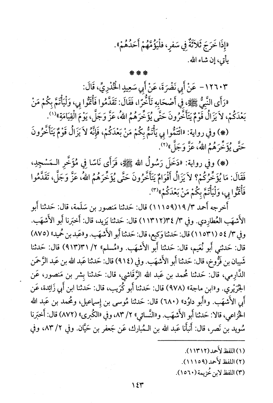 - وفي رواية: «ائتموا بي يأتم بكم من بعدكم، فإنه لا يزال قوم يتأخرون حتى يؤخرهم الله، عز وجل» (¬٢).