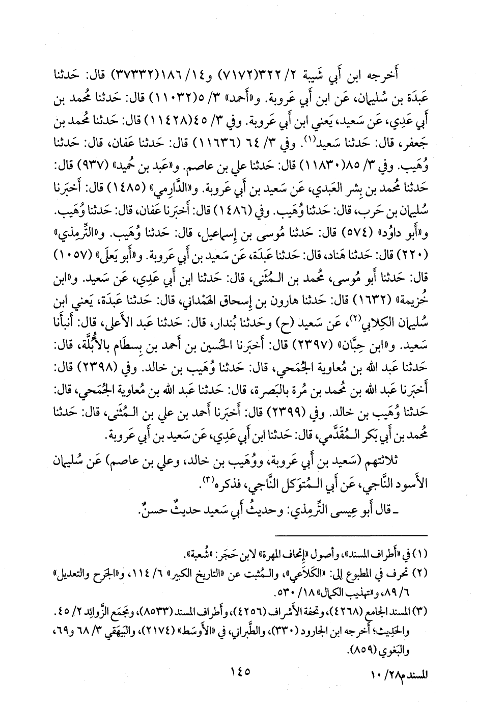 و «الدَّارِمي» (١٤٨٥) قال: أخبرنا سليمان بن حرب، قال: حدثنا وهيب. وفي (١٤٨٦) قال: أخبرنا عفان، قال: حدثنا وهيب. و «أَبو داود» (٥٧٤) قال: حدثنا موسى بن إسماعيل، قال: حدثنا وهيب. و «التِّرمِذي» (٢٢٠) قال: حدثنا هَنَّاد، قال: حدثنا عبدة، عن سعيد بن أبي عَروبَة. و «أَبو يَعلى» (١٠٥٧) قال: حدثنا أَبو موسى، محمد بن المثنى، قال: حدثنا ابن أَبي عَدي، عن سعيد. و «ابن خزيمة» (١٦٣٢) قال: حدثنا هارون بن إسحاق الهمداني، قال: حدثنا عبدة، يعني ابن سليمان الكلابي (¬١)، عن سعيد (ح) وحدثنا بُندَار، قال: حدثنا عبد الأعلى، قال: أنبأنا سعيد. و «ابن حِبَّان» (٢٣٩٧) قال: أخبرنا الحسين بن أحمد بن بِسطام بالأبلة، قال: حدثنا عبد الله بن معاوية الجُمحي، قال: حدثنا وهيب بن خالد. وفي (٢٣٩٨) قال: أخبرنا عبد الله بن محمد بن مُرَّة بالبصرة، قال: حدثنا عبد الله بن معاوية الجُمحي، قال: حدثنا وهيب بن خالد. وفي (٢٣٩٩) قال: أخبرنا أحمد بن علي بن المثنى، قال: حدثنا محمد بن أَبي بكر المُقَدَّمي، قال: حدثنا ابن أَبي عَدي، عن سعيد بن أبي عَروبَة.