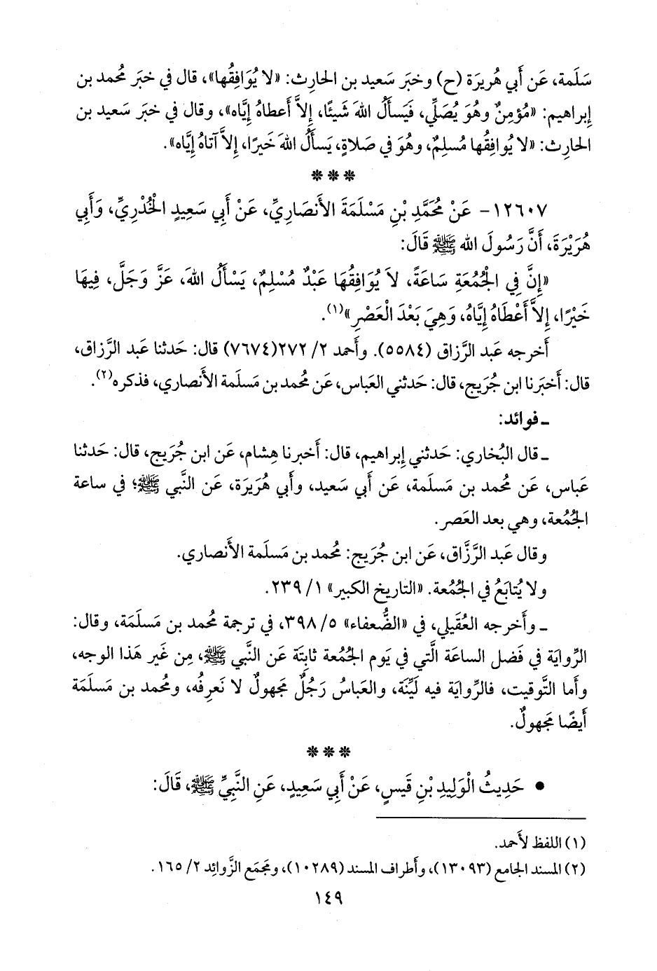 - قلنا: إِسناده ضعيفٌ؛ قال البخاري: حدثني إبراهيم، قال: أخبرنا هشام، عن ابن جُريج، قال: حدثنا عباس، عن محمد بن مَسلَمة، عن أبي سعيد، وأبي هريرة، عن النبي صَلى الله عَليه وسَلم؛ في ساعة الجمعة، وهي بعد العصر.