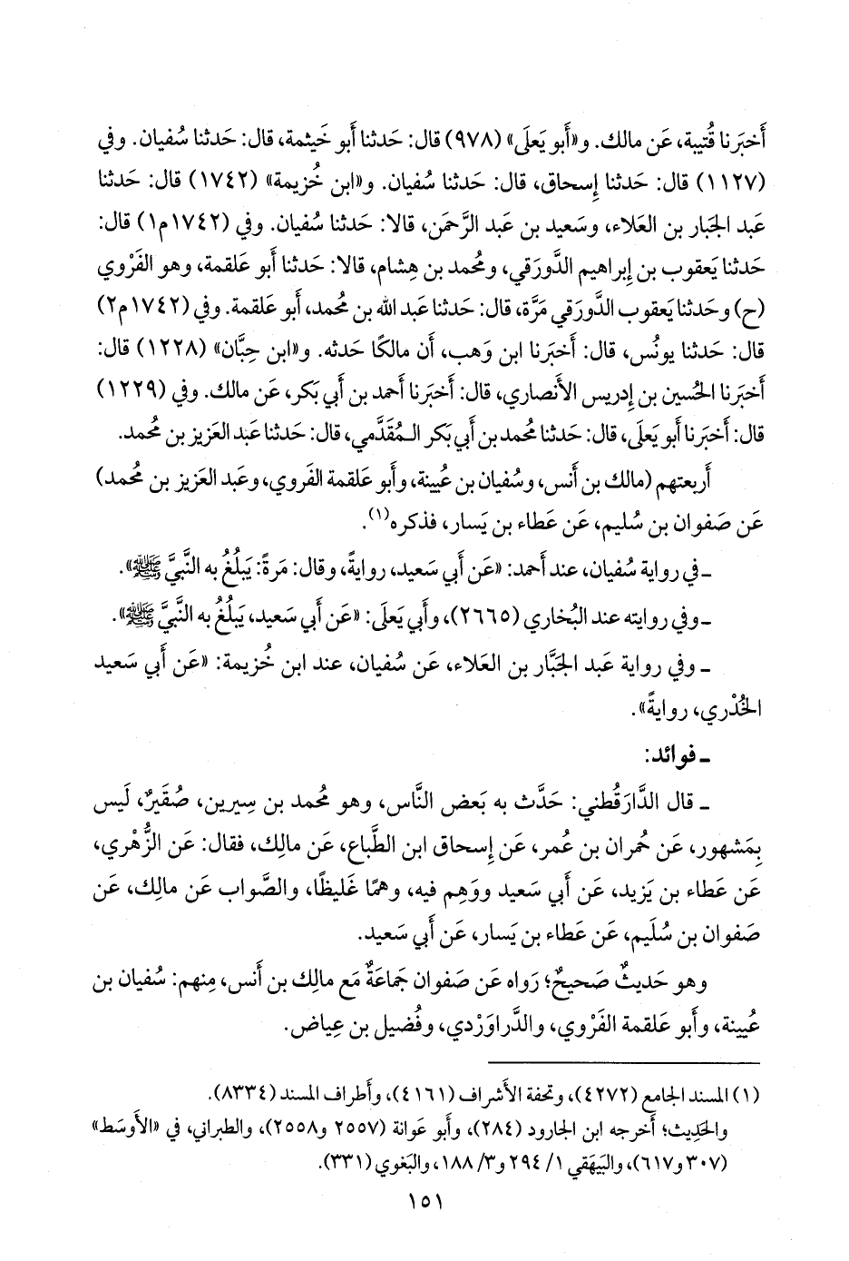 أربعتهم (مالك بن أنس، وسفيان بن عُيينة، وأَبو علقمة الفروي، وعبد العزيز بن محمد) عن صفوان بن سليم، عن عطاء بن يسار، فذكره (¬١).