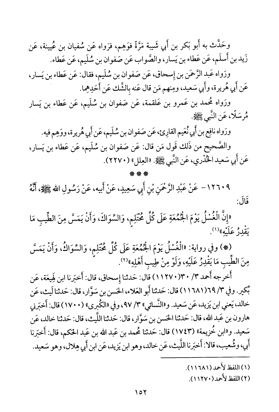 - وفي رواية: «الغسل يوم الجمعة على كل محتلم، والسواك، وأن يمس من الطيب ما يقدر عليه، ولو من طيب أهله» (¬٢).
