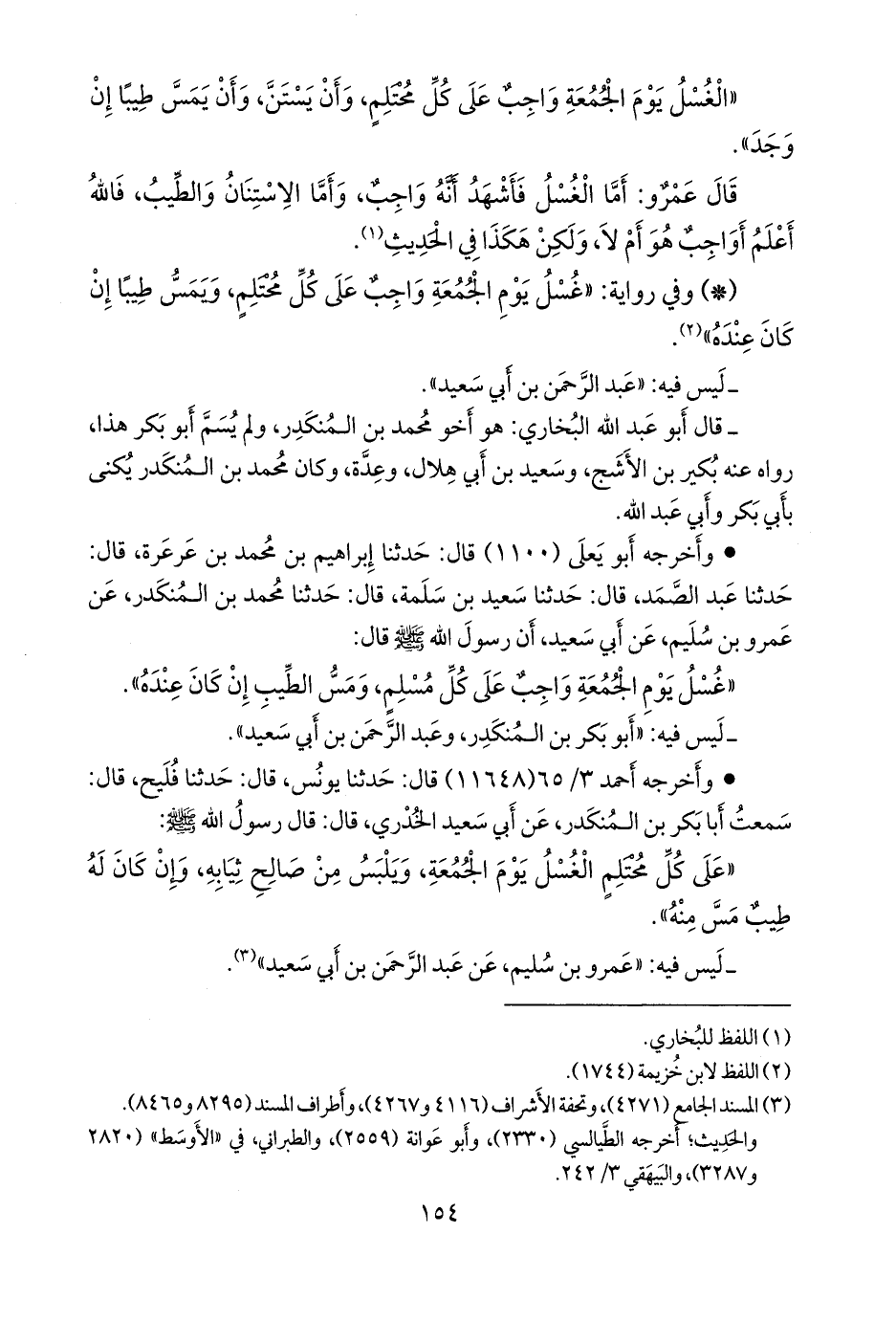 - وفي رواية: «غسل يوم الجمعة واجب على كل محتلم، ويمس طيبا إن كان عنده» (¬١).