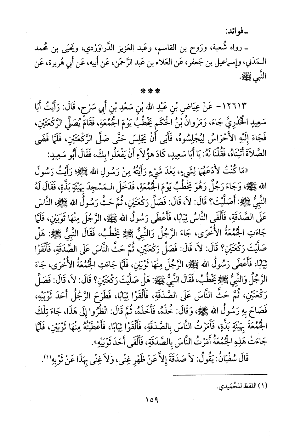 ١٢٦١٣ - عن عياض بن عبد الله بن سعد بن أبي سَرح، قال: رأيت أبا سعيد الخُدْري جاء، ومروان بن الحكم يخطب يوم الجمعة، فقام يصلي الركعتين، فجاء إليه الأحراس ليجلسوه، فأبى أن يجلس حتى صلى الركعتين، فلما قضى الصلاة أتيناه، فقلنا له: يا أبا سعيد، كاد هؤلاء أن يفعلوا بك، فقال أَبو سعيد: