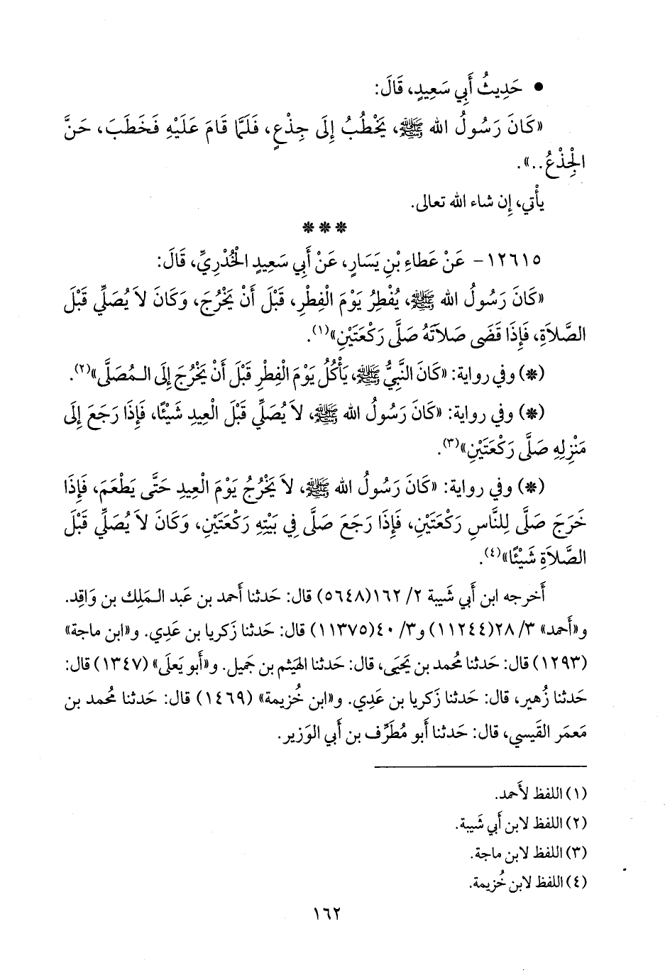 - وفي رواية: «كان رسول الله صَلى الله عَليه وسَلم لا يخرج يوم العيد حتى يَطْعَم، فإذا خرج صلى للناس ركعتين، فإذا رجع صلى في بيته ركعتين، وكان لا يصلي قبل الصلاة شيئا» (¬٤).