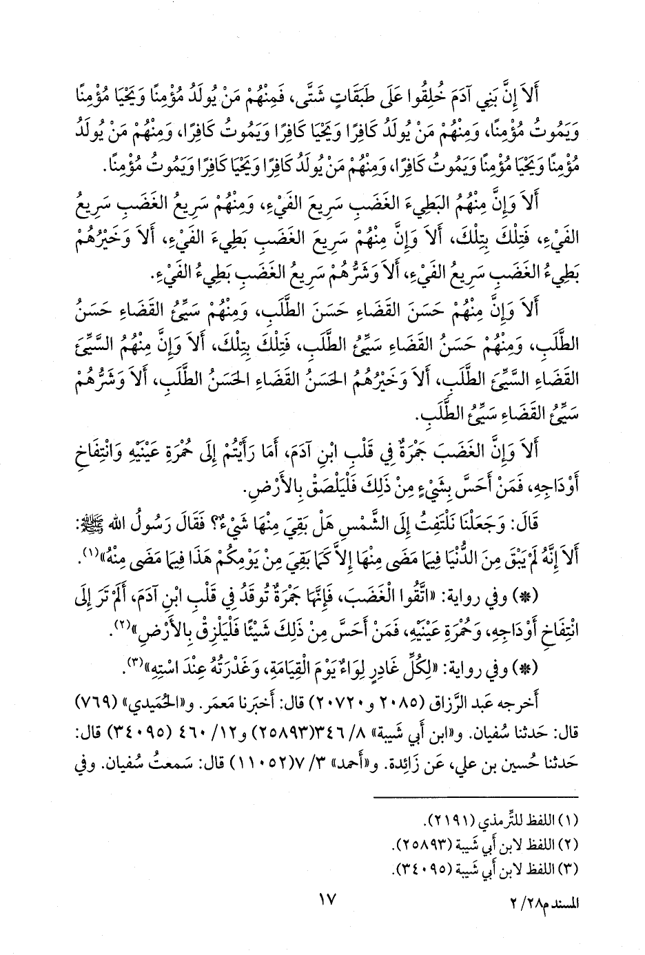 ألا وإن منهم البطيء الغضب سريع الفيء، ومنهم سريع الغضب سريع الفيء، فتلك بتلك، ألا وإن منهم سريع الغضب بطيء الفيء، ألا وخيرهم بطيء الغضب سريع الفيء، ألا وشرهم سريع الغضب بطيء الفيء.