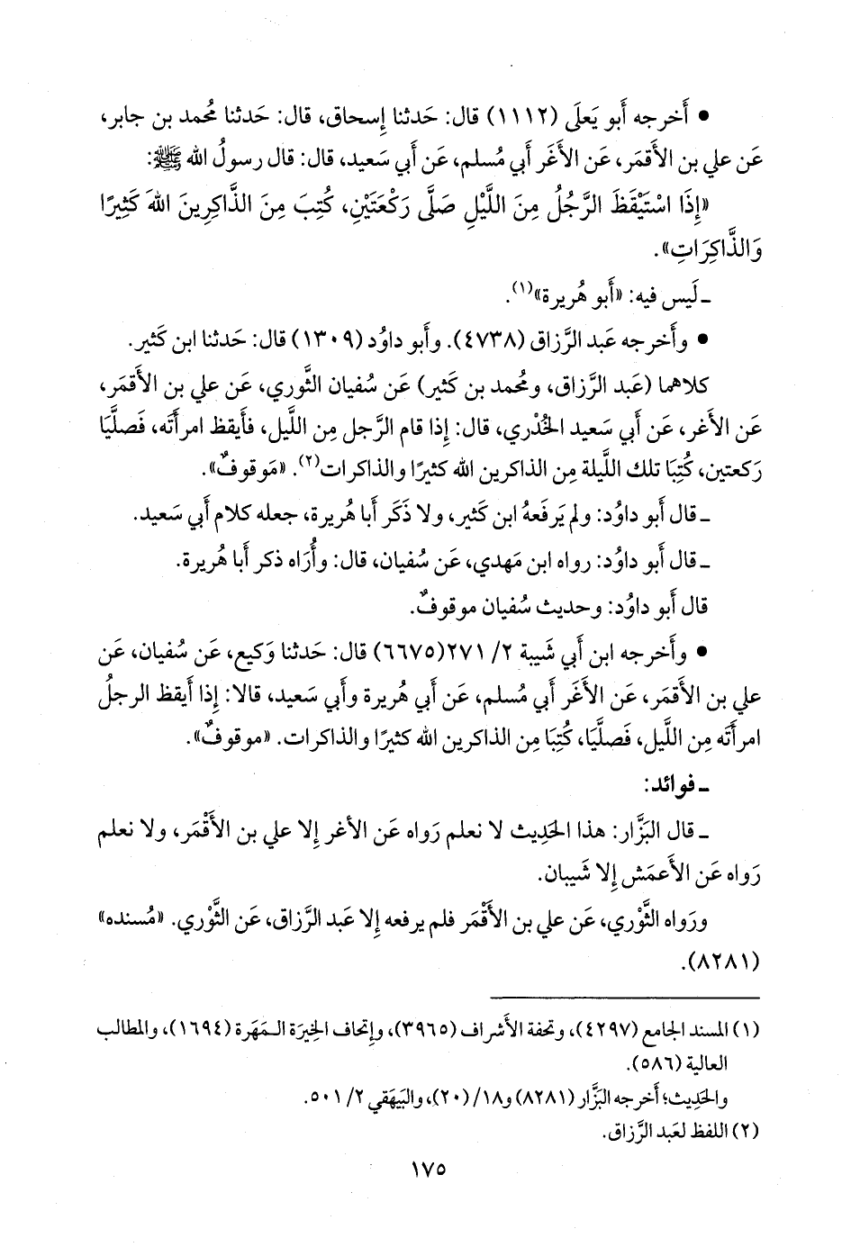 كلاهما (عبد الرزاق، ومحمد بن كثير) عن سفيان الثوري، عن علي بن الأقمر، عن الأغر، عن أبي سعيد الخُدْري، قال: إذا قام الرجل من الليل، فأيقظ امرأته، فصليا ركعتين، كتبا تلك الليلة من الذاكرين الله كثيرا والذاكرات (¬٢). «موقوف».