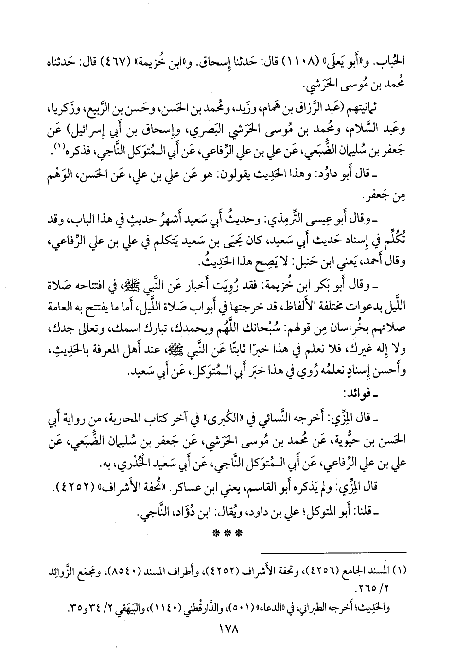 ثمانيتهم (عبد الرزاق بن همام، وزيد، ومحمد بن الحسن، وحسن بن الربيع، وزكريا، وعبد السلام، ومحمد بن موسى الحرشي البصري، وإسحاق بن أبي إسرائيل) عن جعفر بن سليمان الضبعي، عن علي بن علي الرفاعي، عن أبي المتوكل الناجي، فذكره (¬١).