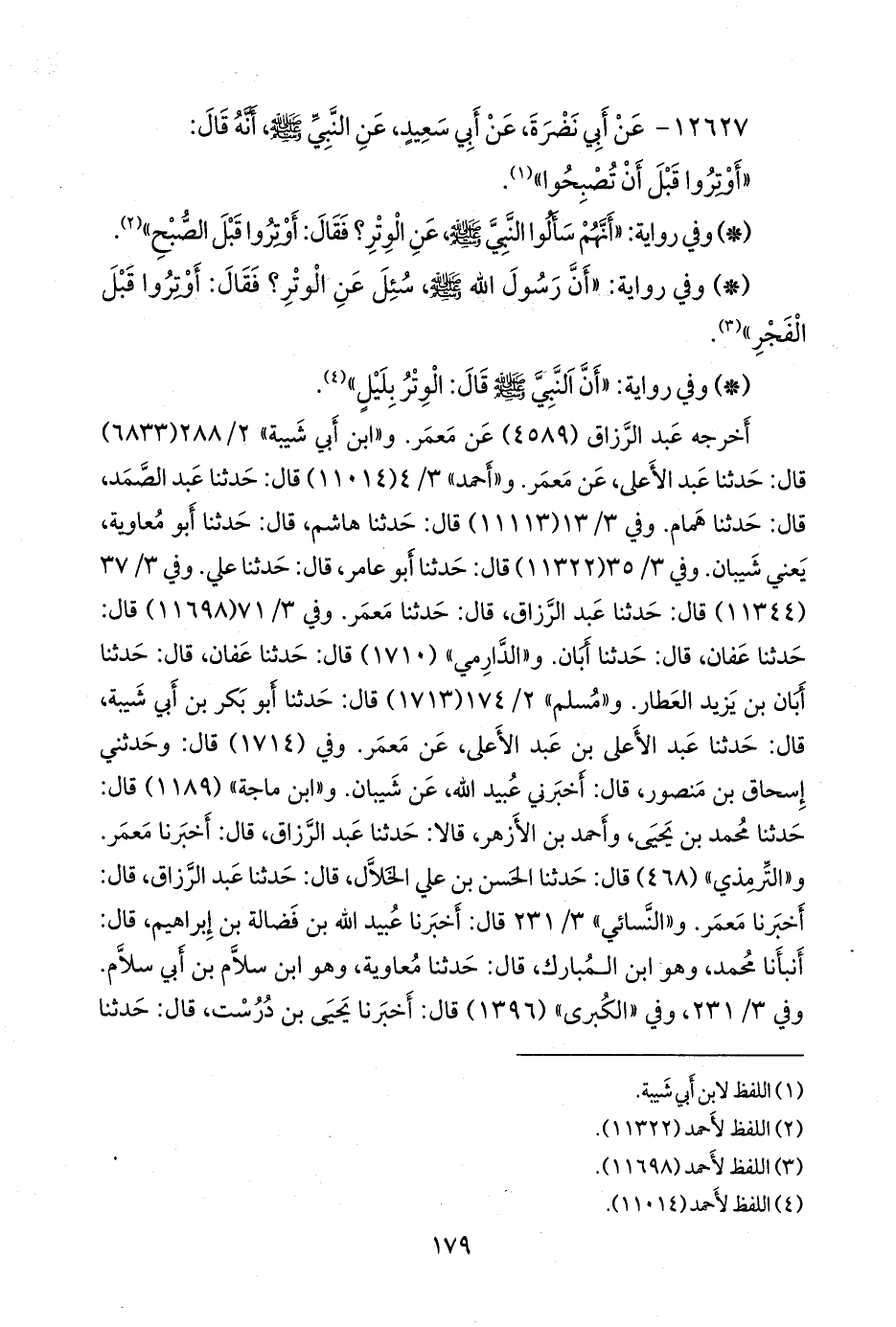 - وفي رواية: «أن النبي صَلى الله عَليه وسَلم قال: الوتر بليل» (¬٤).