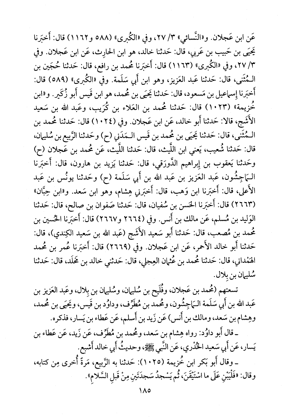وفي (١٠٢٤) قال: حدثنا محمد بن المثنى، قال: حدثنا يحيى بن محمد بن قيس المدني (ح) وحدثنا الربيع بن سليمان، قال: حدثنا شعيب، يعني ابن الليث، قال: حدثنا الليث، عن محمد بن عَجلان (ح) وحدثنا يعقوب بن إبراهيم الدورقي، قال: حدثنا يزيد بن هارون، قال: أخبرنا المَاجِشون عبد العزيز بن عبد الله بن أبي سلمة (ح) وحدثنا يونس بن عبد الأعلى، قال: أخبرنا ابن وهب، قال: أخبرني هشام، وهو ابن سعد. و «ابن حِبَّان» (٢٦٦٣) قال: أخبرنا الحسن بن سفيان، قال: حدثنا صفوان بن صالح، قال: حدثنا الوليد بن مسلم، عن مالك بن أنس. وفي (٢٦٦٤ و ٢٦٦٧) قال: أخبرنا الحسين بن محمد بن مصعب، قال: حدثنا أَبو سعيد الأشج (عبد الله بن سعيد الكندي)، قال: حدثنا أَبو خالد الأحمر، عن ابن عَجلان. وفي (٢٦٦٩) قال: أخبرنا عمر بن محمد الهمداني، قال: حدثنا محمد بن عثمان العجلي، قال: حدثني خالد بن مخلد، قال: حدثنا سليمان بن بلال.