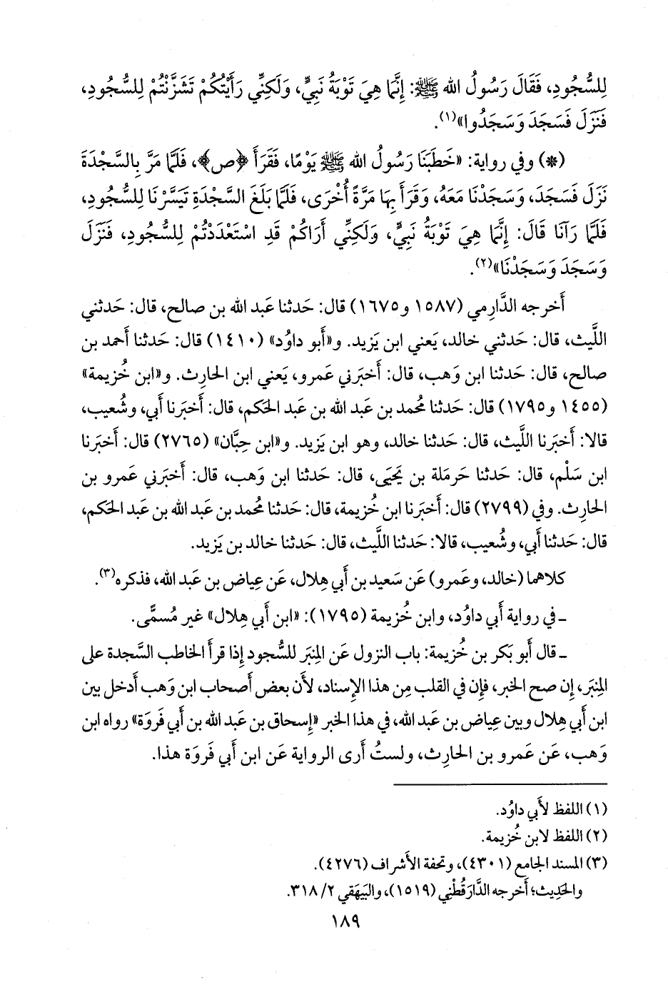 - قال ابن خزيمة: باب النزول عن المنبر للسجود إذا قرأ الخاطب السجدة على المنبر، إن صح الخبر، فإن في القلب من هذا الإسناد، لأن بعض أصحاب ابن وهب أدخل بين ابن أبي هلال وبين عياض بن عبد الله، في هذا الخبر «إسحاق بن عبد الله بن أبي فروة» رواه ابن وهب، عن عَمرو بن الحارث، ولست أرى الرواية عن ابن أبي فروة هذا.