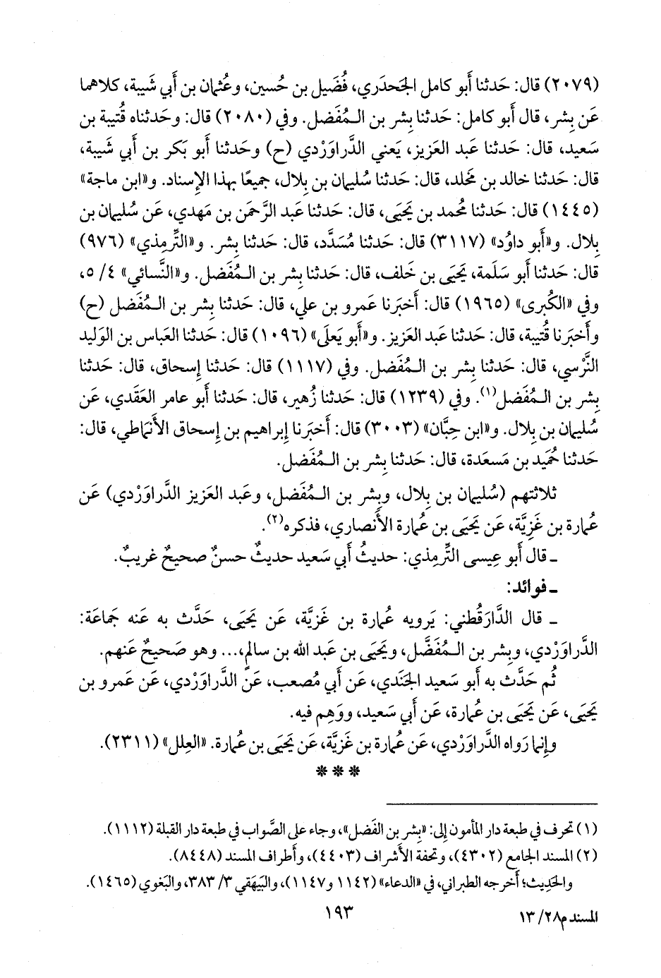 و «ابن ماجة» (١٤٤٥) قال: حدثنا محمد بن يحيى، قال: حدثنا عبد الرَّحمَن بن مهدي، عن سليمان بن بلال. و «أَبو داود» (٣١١٧) قال: حدثنا مُسدد، قال: حدثنا بشر. و «التِّرمِذي» (٩٧٦) قال: حدثنا أَبو سلمة، يحيى بن خلف، قال: حدثنا بشر بن المُفَضَّل. و «النَّسَائي» ٤/ ٥، وفي «الكبرى» (١٩٦٥) قال: أخبرنا عَمرو بن علي، قال: حدثنا بشر بن المُفَضَّل (ح) وأخبرنا قتيبة، قال: حدثنا عبد العزيز. و «أَبو يَعلى» (١٠٩٦) قال: حدثنا العباس بن الوليد النَّرْسي، قال: حدثنا بشر بن المُفَضَّل. وفي (١١١٧) قال: حدثنا إسحاق، قال: حدثنا بشر بن المُفَضَّل (¬١). وفي (١٢٣٩) قال: حدثنا زهير، قال: حدثنا أَبو عامر العَقَدي، عن سليمان بن بلال. و «ابن حِبَّان» (٣٠٠٣) قال: أخبرنا إبراهيم بن إسحاق الأنماطي، قال: حدثنا حميد بن مَسعَدة، قال: حدثنا بشر بن المُفَضَّل.