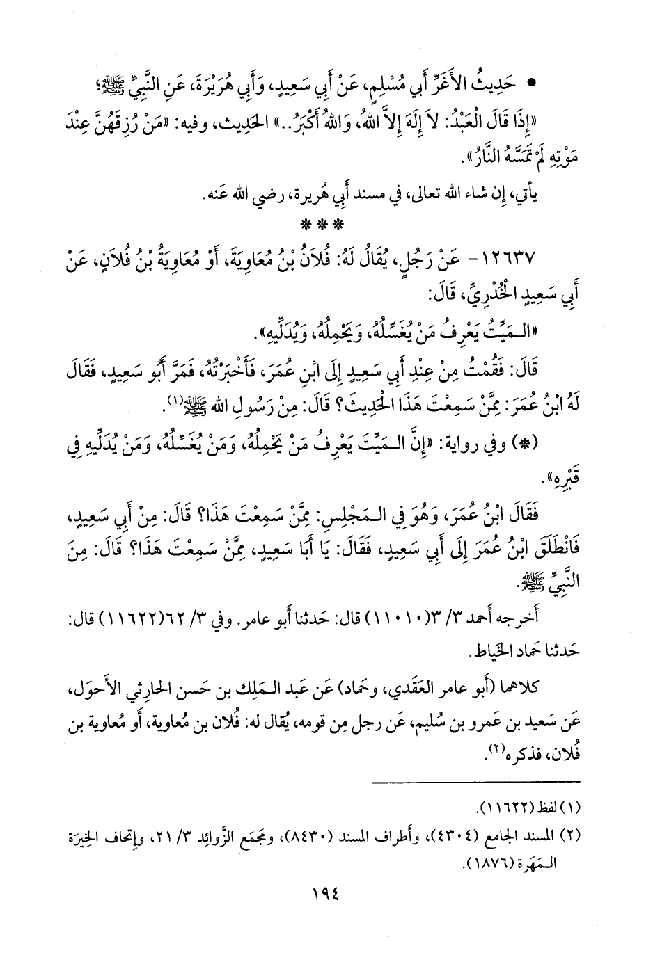 - وفي رواية: «عن معاوية، أو ابن معاوية, يحدث عن أبي سعيد الخدري, أن النبي صَلى الله عَليه وسَلم قال: إن الميت يعرف من يحمله، ومن يغسله، ومن يدليه في قبره».