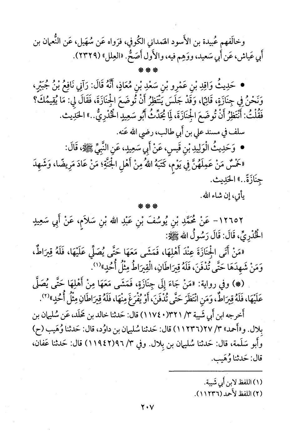 • حديث واقد بن عمرو بن سعد بن معاذ، أنه قال: رآني نافع بن جبير، ونحن في جنازة، قائما، وقد جلس ينتظر أن توضع الجنازة، فقال: ما يقيمك؟ فقلت: أنتظر أن توضع الجنازة لما يحدث أبو سعيد الخدري».
