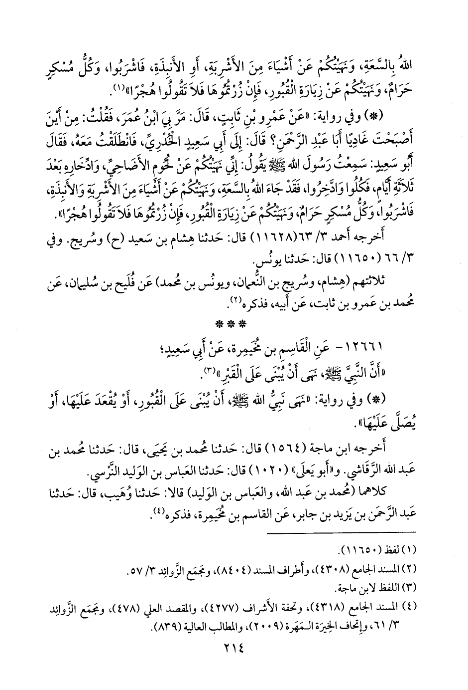 - وفي رواية: «عن عَمرو بن ثابت، قال: مر بي ابن عمر، فقلت: من أين أصبحت غاديا أبا عبد الرَّحمَن؟ قال: إلى أبي سعيد الخُدْري، فانطلقت معه، فقال أَبو سعيد: سمعت رسول الله صَلى الله عَليه وسَلم يقول: إني نهيتكم عن لحوم الأضاحي، وادخاره بعد ثلاثة أيام، فكلوا وادخروا، فقد جاء الله بالسعة، ونهيتكم عن أشياء من الأشربة والأنبذة، فاشربوا، وكل مسكر حرام، ونهيتكم عن زيارة القبور، فإن زرتموها فلا تقولوا هجرا».
