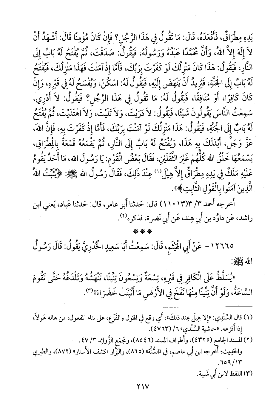 • أَخرجه أَبو يَعلى (١٣٢٩) قال: حدثنا زهير، قال: حدثنا عبد الله بن يزيد، قال: حدثنا سعيد بن أَبي أَيوب، قال: سمعت دراجا أبا السمح يقول: سمعت أبا الهيثم يقول: سمعت أبا سعيد الخُدْري يقول: يسلط على الكافر في قبره، تسعة وتسعون تنينا، تنهشه وتلدغه حتى تقوم الساعة، فلو أن تنينا منها نفخت في الأرض، ما نبتت خضراء. «موقوف» (¬٣).