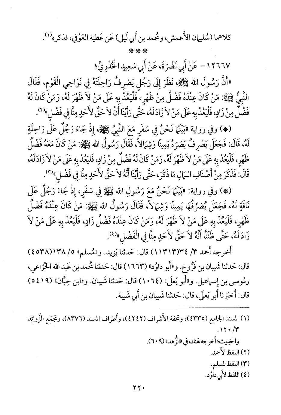 - وفي رواية: «بينما نحن مع رسول الله صَلى الله عَليه وسَلم في سفر، إذ جاء رجل على ناقة له، فجعل يصرفها يمينا وشمالا، فقال رسول الله صَلى الله عَليه وسَلم: من كان عنده فضل ظهر، فليعد به على من لا ظهر له، ومن كان عنده فضل زاد، فليعد به على من لا زاد له، حتى ظننا أنه لا حق لأحد منا في الفضل» (¬٣).