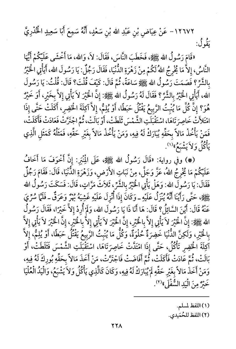«قام رسول الله صَلى الله عَليه وسَلم فخطب الناس، فقال: لا، والله، ما أخشى عليكم أيها الناس، إلا ما يخرج الله لكم من زهرة الدنيا، فقال رجل: يا رسول الله، أيأتي الخير بالشر؟ فصمت رسول الله صَلى الله عَليه وسَلم ساعة، ثم قال: كيف قلت؟ قال: قلت: يا رسول الله، أيأتي الخير بالشر؟ فقال له رسول الله صَلى الله عَليه وسَلم: إن الخير لا يأتي إلا بخير، أو خير هو؟ إن كل ما ينبت الربيع يقتل حبطا، أو يلم، إلا آكلة الخضر، أكلت حتى إذا امتلأت خاصرتاها، استقبلت الشمس ثلطت، أو بالت، ثم اجترت فعادت فأكلت، فمن يأخذ مالا بحقه يبارك له فيه، ومن يأخذ مالا بغير حقه، فمثله كمثل الذي يأكل ولا يشبع» (¬١).