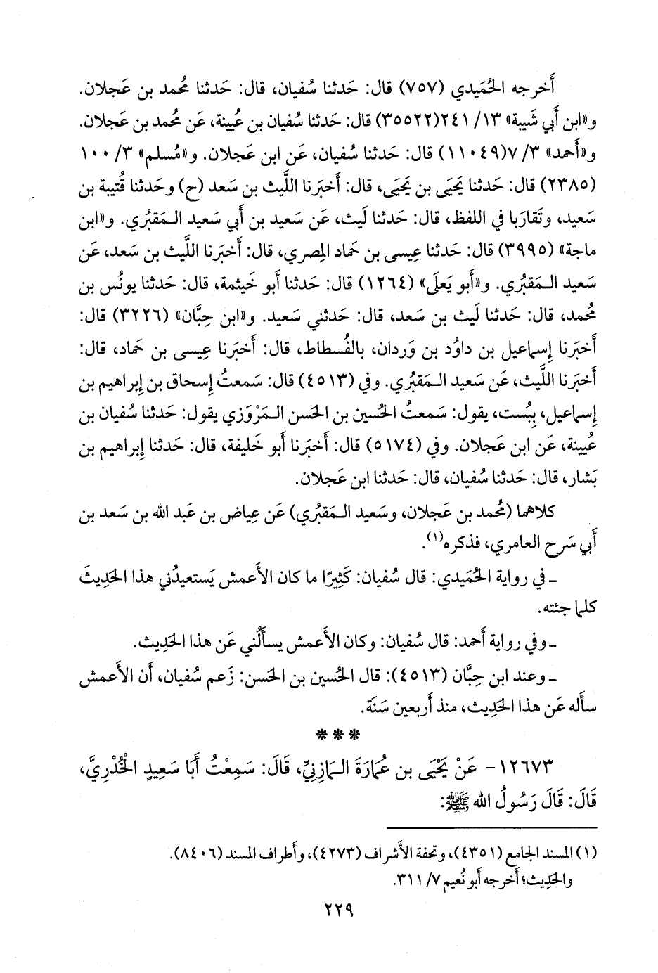 أخرجه الحُميدي (٧٥٧) قال: حدثنا سفيان، قال: حدثنا محمد بن عَجلان. و «ابن أبي شيبة» (٣٥٥٢٢) قال: حدثنا سفيان بن عُيينة، عن محمد بن عَجلان. و «أحمد» ٣/ ٧ (١١٠٤٩) قال: حدثنا سفيان، عن ابن عَجلان. و «مسلم» ٣/ ١٠٠ (٢٣٨٥) قال: حدثنا يحيى بن يحيى، قال: أخبرنا الليث بن سعد (ح) وحدثنا قتيبة بن سعيد، وتقاربا في اللفظ، قال: حدثنا ليث، عن سعيد بن أبي سعيد المَقبُري. و «ابن ماجة» (٣٩٩٥) قال: حدثنا عيسى بن حماد المصري، قال: أخبرنا الليث بن سعد، عن سعيد المَقبُري. و «أَبو يَعلى» (١٢٦٤) قال: حدثنا أَبو خيثمة، قال: حدثنا يونس بن محمد، قال: حدثنا ليث بن سعد، قال: حدثني سعيد. و «ابن حِبَّان» (٣٢٢٦) قال: أخبرنا إسماعيل بن داود بن وَردان، بالفسطاط، قال: أخبرنا عيسى بن حماد، قال: أخبرنا الليث، عن سعيد المَقبُري. وفي (٤٥١٣) قال: سمعت إسحاق بن إبراهيم بن إسماعيل، ببست، يقول: سمعت الحسين بن الحسن المَرْوَزي يقول: حدثنا سفيان بن عُيينة، عن ابن عَجلان. وفي (٥١٧٤) قال: أخبرنا أَبو خليفة، قال: حدثنا إبراهيم بن بشار، قال: حدثنا سفيان، قال: حدثنا ابن عَجلان.