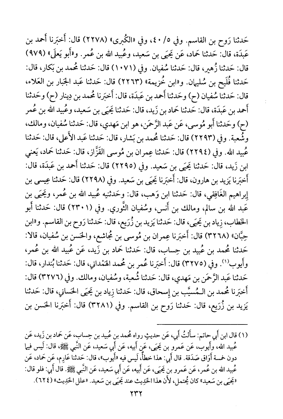 و «ابن حِبَّان» (٣٢٦٨) قال: أخبرنا عمران بن موسى بن مجاشع، والحسن بن سفيان، قالا: حدثنا محمد بن عبيد بن حساب، قال: حدثنا حماد بن زيد، عن عُبيد الله بن عمر، وأيوب. وفي (٣٢٧٥) قال: أخبرنا عمر بن محمد الهمداني، قال: حدثنا بُندَار، قال: حدثنا عبد الرَّحمَن بن مهدي، قال: حدثنا شعبة، وسفيان، ومالك. وفي (٣٢٧٦) قال: أخبرنا محمد بن المُسَيَّب بن إسحاق، قال: حدثنا زياد بن يحيى الحساني، قال: حدثنا يزيد بن زُريع، قال: حدثنا روح بن القاسم. وفي (٣٢٨١) قال: أخبرنا الحسن بن