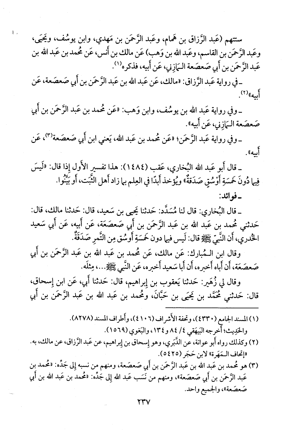 - وفي رواية عبد الله بن يوسف، وابن وهب: «عن محمد بن عبد الرَّحمَن بن أبي صعصعة المازني، عن أبيه».