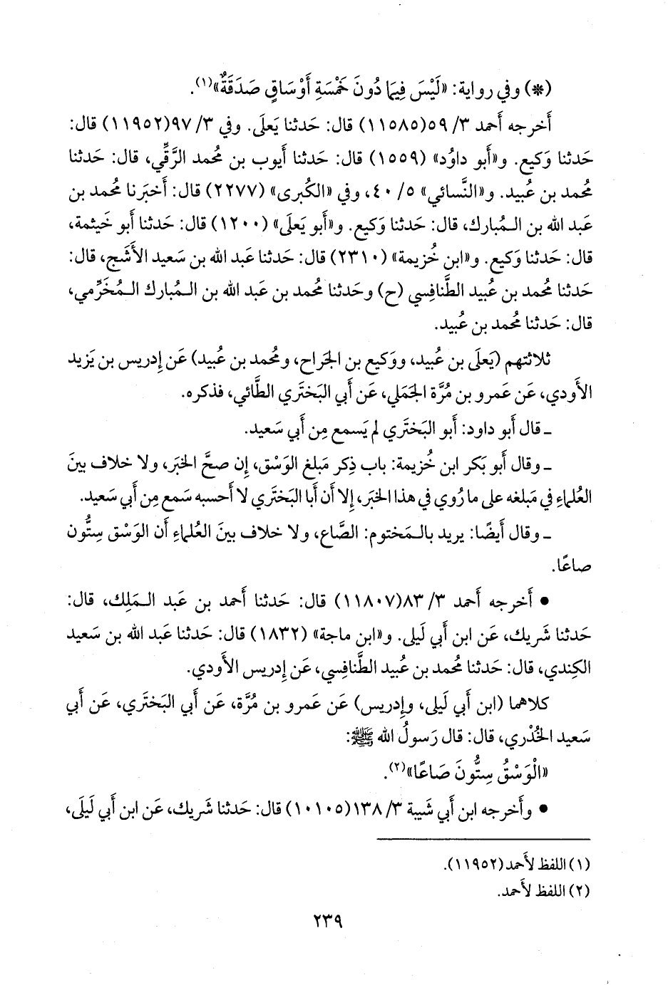 - وقال ابن خزيمة: باب ذكر مبلغ الوَسْق، إن صح الخبر، ولا خلاف بين العلماء في مبلغه على ما روي في هذا الخبر، إلا أن أبا البَختَري لا أحسبه سمع من أبي سعيد.