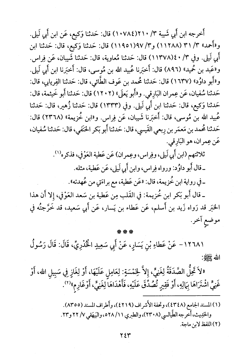 وفي ٣/ ٤٠ (١١٣٧٨) قال: حدثنا معاوية، قال: حدثنا شَيبان، عن فراس. و «عَبد بن حُميد» (٨٩٦) قال: أخبرنا عُبيد الله بن موسى، قال: أخبرنا ابن أبي ليلى. و «أَبو داود» (١٦٣٧) قال: حدثنا محمد بن عوف الطائي، قال: حدثنا الفريابي، قال: حدثنا سفيان، عن عمران البارقي. و «أَبو يَعلى» (١٢٠٢) قال: حدثنا أَبو خيثمة، قال: حدثنا وكيع، قال: حدثنا ابن أبي ليلى. وفي (١٣٣٣) قال: حدثنا زهير، قال: حدثنا عُبيد الله بن موسى، قال: أخبرنا شَيبان، عن فراس. و «ابن خزيمة» (٢٣٦٨) قال: حدثنا محمد بن معمر بن رِبعي القيسي، قال: حدثنا أَبو بكر الحنفي، قال: حدثنا سفيان، عن عمران، هو البارقي.