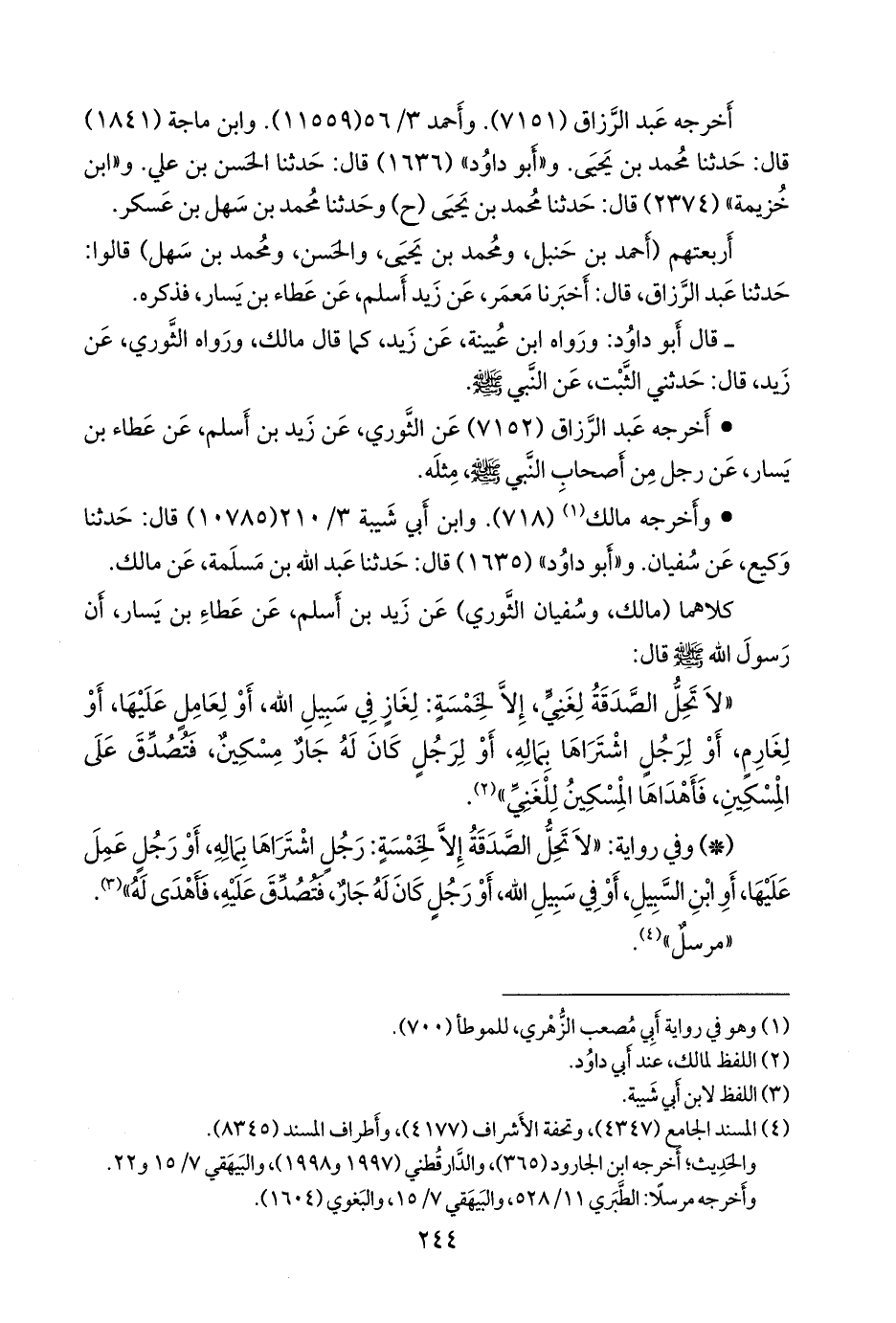 - وفي رواية: «لا تحل الصدقة إلا لخمسة: رجل اشتراها بماله، أو رجل عمل عليها، أو ابن السبيل، أو في سبيل الله، أو رجل كان له جار، فتصدق عليه، فأهدى له» (¬٣).