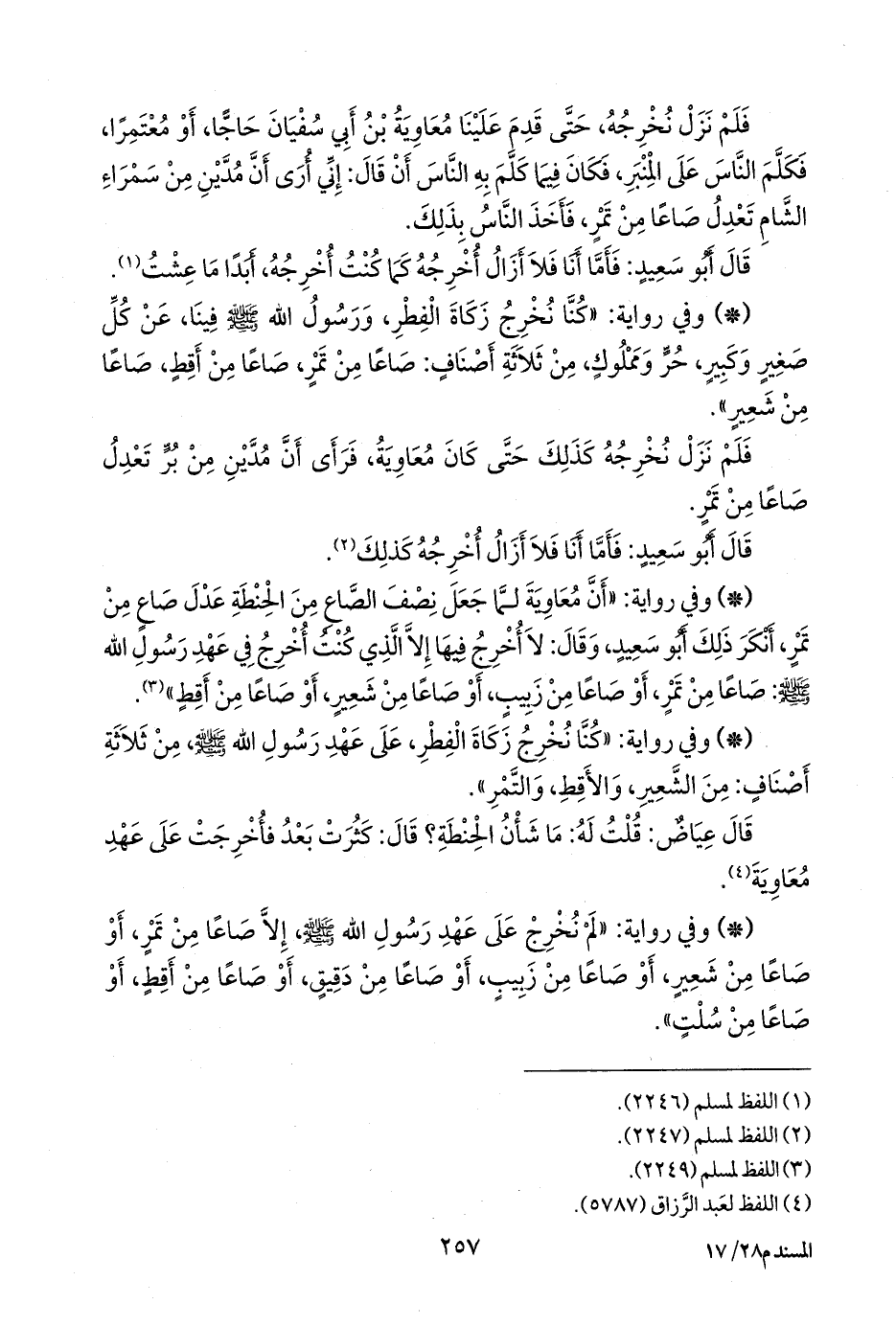 - وفي رواية: «لم نخرج على عهد رسول الله صَلى الله عَليه وسَلم إلا صاعا من تمر، أو صاعا من شعير، أو صاعا من زبيب، أو صاعا من دقيق، أو صاعا من أقط، أو صاعا من سلت».