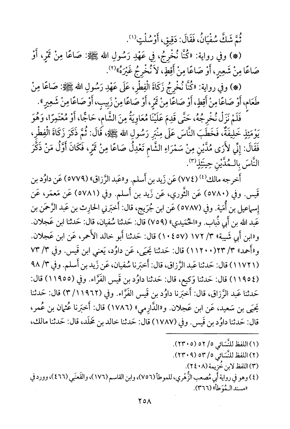 عن زيد بن أسلم. وفي (١٧٨٨) قال: أخبرنا عُبيد الله بن موسى، عن سفيان، عن زيد بن أسلم. و «البخاري» ٢/ ١٣١ (١٥٠٥) قال: حدثنا قَبيصَة، قال: حدثنا سفيان، عن زيد بن أسلم. وفي (١٥٠٦) قال: حدثنا عبد الله بن يوسف، قال: أخبرنا مالك، عن زيد بن أسلم. وفي (١٥٠٨) قال: حدثنا عبد الله بن منير، سمع يزيد العدني، قال: حدثنا سفيان، عن زيد بن أسلم. وفي ٢/ ١٣١ (١٥١٠) قال: حدثنا معاذ بن فضالة، قال: حدثنا أَبو عمر، عن زيد. و «مسلم» ٣/ ٦٩ (٢٢٤٥) قال: حدثنا يحيى بن يحيى، قال: قرأت على مالك، عن زيد بن أسلم. وفي (٢٢٤٦) قال: حدثنا عبد الله بن مَسلَمة بن قعنب، قال: حدثنا داود، يعني ابن قيس. وفي (٢٢٤٧) قال: حدثنا محمد بن رافع، قال: حدثنا عبد الرزاق، عن مَعمَر، عن إسماعيل بن أُمية. وفي (٢٢٤٨) قال: وحدثني محمد بن رافع، قال: حدثنا عبد الرزاق، قال: أخبرنا ابن جُريج، عن الحارث بن عبد الرَّحمَن بن أبي ذُبَاب. وفي ٣/ ٧٠ (٢٢٤٩) قال: وحدثني عَمرو الناقد، قال: حدثنا حاتم بن إسماعيل، عن ابن عَجلان. و «ابن ماجة» (١٨٢٩) قال: حدثنا علي بن محمد، قال: حدثنا وكيع، عن داود بن قيس الفراء. و «أَبو داود» (١٦١٦) قال: حدثنا عبد الله بن مَسلَمة، قال: حدثنا داود، يعني ابن قيس. وفي (١٦١٨) قال: حدثنا حامد بن يحيى، قال: أخبرنا سفيان (ح) وحدثنا مُسدد، قال: حدثنا يحيى، عن ابن عَجلان. و «التِّرمِذي» (٦٧٣) قال: حدثنا محمود بن غَيلان، قال: حدثنا وكيع، عن سفيان، عن زيد بن أسلم. و «النَّسَائي» ٥/ ٥١، وفي «الكبرى» (٢٣٠٣) قال: أخبرنا محمد بن عبد الله بن المبارك، قال: حدثنا وكيع، عن سفيان، عن زيد بن أسلم. وفي ٥/ ٥١، وفي «الكبرى» (٢٣٠٤) قال: أخبرنا هَنَّاد بن السَّري، عن وكيع، عن داود بن قيس.