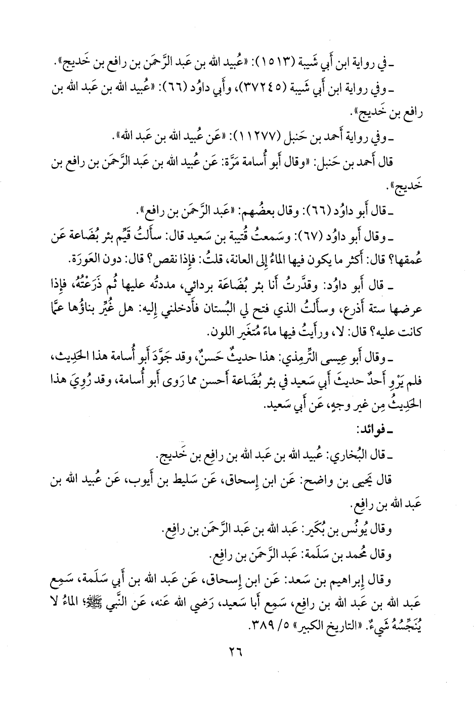 قال أحمد بن حنبل: «وقال أَبو أُسامة مرة: عن عُبيد الله بن عبد الرَّحمَن بن رافع بن خَدِيج».
