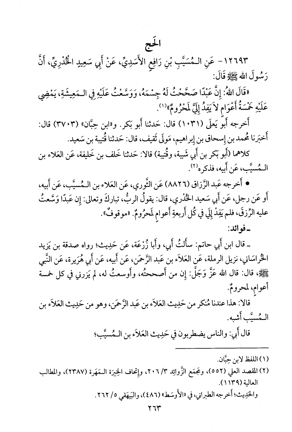 - قال عبد الرَّحمَن بن أبي حاتم الرازي: سألت أبي، وأَبا زُرعَة، عن حديث؛ رواه صدقة بن يزيد الخراساني، نزيل الرملة، عن العلاء بن عبد الرَّحمَن، عن أبيه، عن أبي هريرة، عن النبي صَلى الله عَليه وسَلم قال: قال الله عز وجل: إن من أصححته، وأوسعت له، لم يزرني في كل خمسة أعوام، لمحروم.