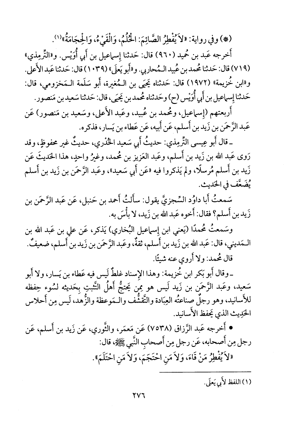 - وقال ابن خزيمة: وهذا الإسناد غلط ليس فيه عطاء بن يسار، ولا أَبو سعيد، وعبد الرَّحمَن بن زيد ليس هو ممن يحتج أهل التثبت بحديثه لسوء حفظه للأسانيد، وهو رجل صناعته العبادة والتقشف والموعظة والزهد، ليس من أحلاس الحديث الذي يحفظ الأسانيد.