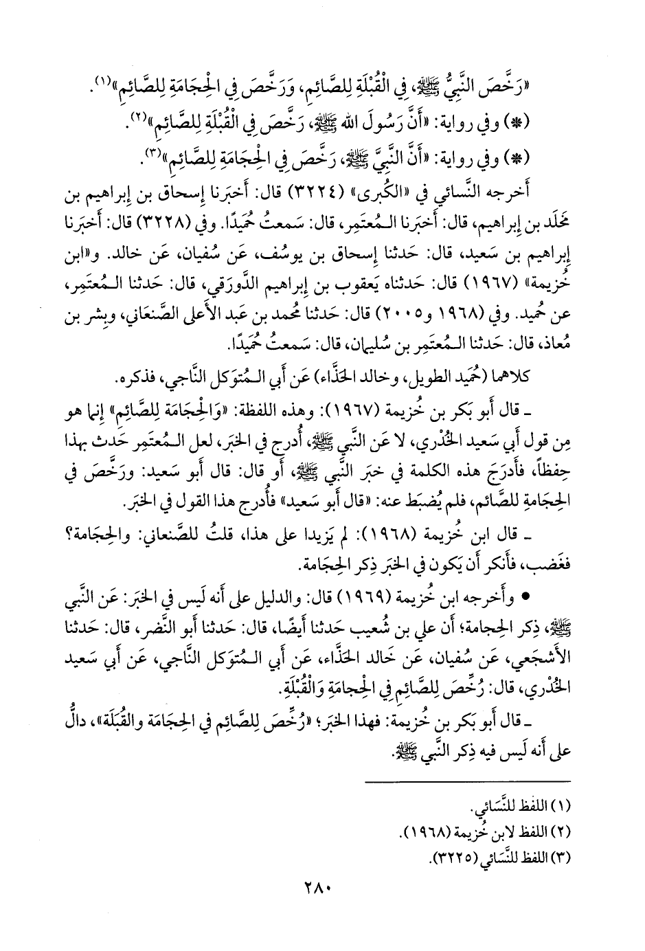 - قال ابن خزيمة: فهذا الخبر؛ «رخص للصائم في الحجامة والقبلة»، دال على أنه ليس فيه ذكر النبي صَلى الله عَليه وسَلم.