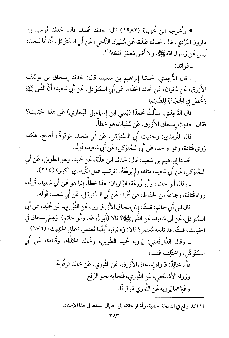 - قال التِّرمِذي: حدثنا إبراهيم بن سعيد، قال: حدثنا إسحاق بن يوسف الأزرق، عن سفيان، عن خالد الحَذَّاء، عن أبي المتوكل، عن أبي سعيد؛ أن النبي صَلى الله عَليه وسَلم رخص في الحجامة للصائم».
