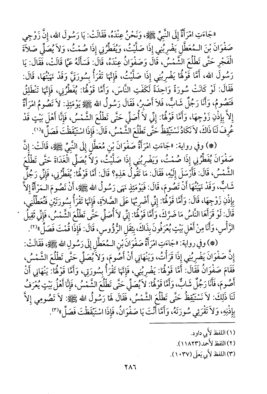 - وفي رواية: «جاءت امرأة صفوان بن المعطل إلى رسول الله صَلى الله عَليه وسَلم فقالت: إن صفوان يضربني إذا قرأت، وينهاني أن أصوم، ولا يصلي حتى تطلع الشمس، فقام صفوان فقال: أما قولها: يضربني، فإنها تقرأ بسورتي، وأما قولها: ينهاني أن أصوم، فأنا رجل شاب، وأما قولها: لا يصلي حتى تطلع الشمس، فإنا أهل بيت يعرف لنا ذلك: لا نستيقظ حتى تطلع الشمس، فقال لها رسول الله صَلى الله عَليه وسَلم: لا تصومي إلا بإذنه، ولا تقرئي سورته، وأما أنت يا صفوان، فإذا استيقظت فصل» (¬٢).