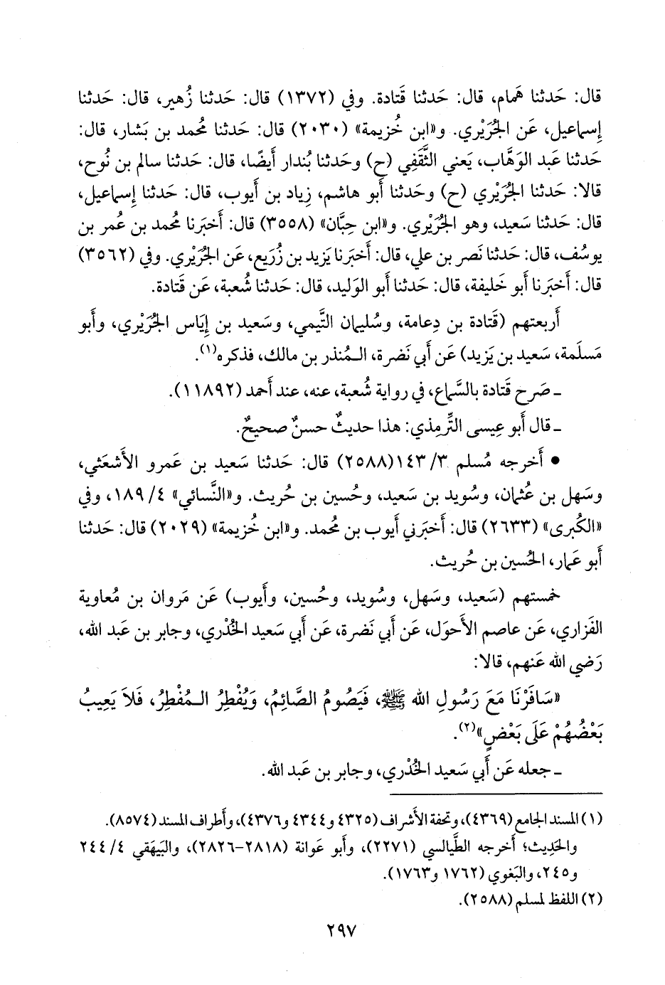 و «ابن خزيمة» (٢٠٣٠) قال: حدثنا محمد بن بشار، قال: حدثنا عبد الوَهَّاب، يعني الثقفي (ح) وحدثنا بندار أيضا، قال: حدثنا سالم بن نوح، قالا: حدثنا الجُريري (ح) وحدثنا أَبو هاشم، زياد بن أيوب، قال: حدثنا إسماعيل، قال: حدثنا سعيد، وهو الجُريري. و «ابن حِبَّان» (٣٥٥٨) قال: أخبرنا محمد بن عمر بن يوسف، قال: حدثنا نصر بن علي، قال: أخبرنا يزيد بن زُريع، عن الجُريري. وفي (٣٥٦٢) قال: أخبرنا أَبو خليفة، قال: حدثنا أَبو الوليد، قال: حدثنا شعبة، عن قتادة.