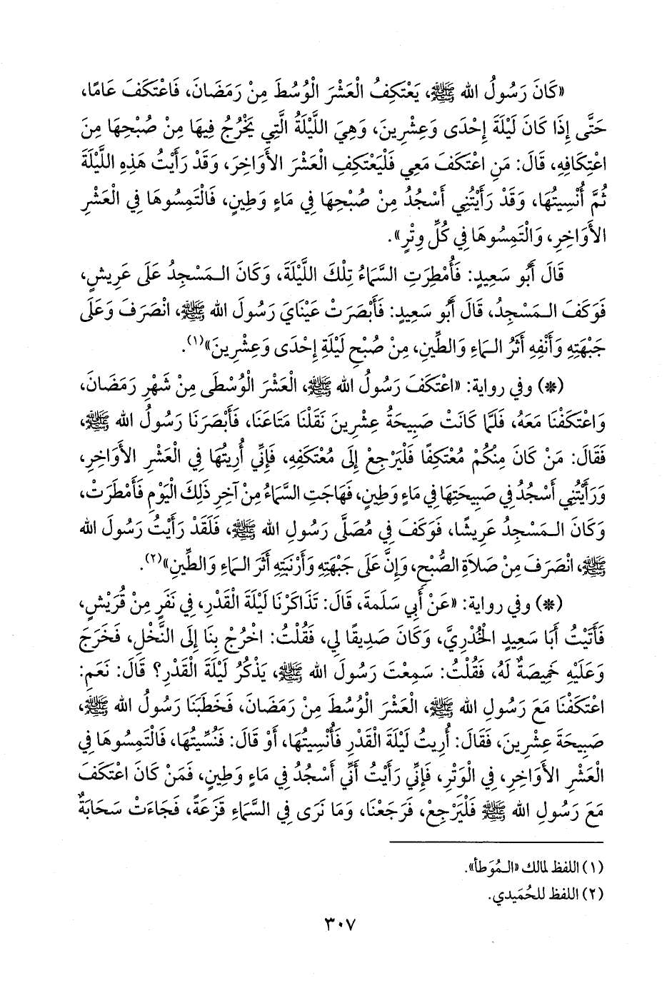 - وفي رواية: «عن أبي سلمة، قال: تذاكرنا ليلة القدر، في نفر من قريش، فأتيت أبا سعيد الخُدْري، وكان صديقا لي، فقلت: اخرج بنا إلى النخل، فخرج وعليه خميصة له، فقلت: سمعت رسول الله صَلى الله عَليه وسَلم يذكر ليلة القدر؟ قال: نعم: اعتكفنا مع رسول الله صَلى الله عَليه وسَلم العشر الوسط من رمضان، فخطبنا رسول الله صَلى الله عَليه وسَلم صبيحة عشرين، فقال: أريت ليلة القدر فأنسيتها، أو قال: فنسيتها، فالتمسوها في العشر الأواخر، في الوتر، فإني رأيت أني أسجد في ماء وطين، فمن كان اعتكف مع رسول الله صَلى الله عَليه وسَلم فليرجع، فرجعنا، وما نرى في السماء قزعة، فجاءت سحابة