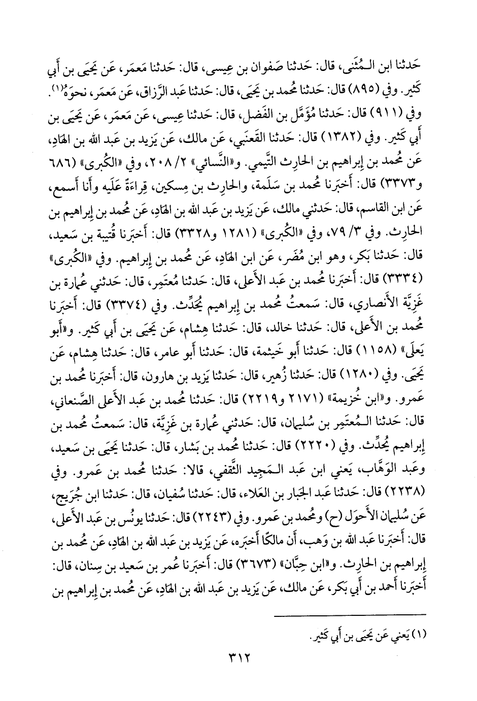 الحارث التيمي. وفي (٣٦٧٤) قال: أخبرنا محمد بن عبد الله بن الجنيد، قال: حدثنا قتيبة بن سعيد، قال: حدثنا بكر بن مضر، عن ابن الهاد، عن محمد بن إبراهيم. وفي (٣٦٧٧) قال: أخبرنا أحمد بن علي بن المثنى، قال: حدثنا أَبو خيثمة، قال: حدثنا يزيد بن هارون، قال: أخبرنا محمد بن عَمرو. وفي (٣٦٨٤) قال: أخبرنا عمر بن محمد الهمداني، قال: حدثنا محمد بن عبد الأعلى، قال: حدثنا مُعتَمِر بن سليمان، قال: حدثني عمارة بن غَزِيَّة، قال: سمعت محمد بن إبراهيم يحدث. وفي (٣٦٨٥) قال: أخبرنا عبد الله بن محمد بن سَلم، قال: حدثنا عبد الرَّحمَن بن إبراهيم، قال: حدثنا الوليد، قال: حدثنا الأوزاعي، قال: حدثني يحيى بن أبي كثير.