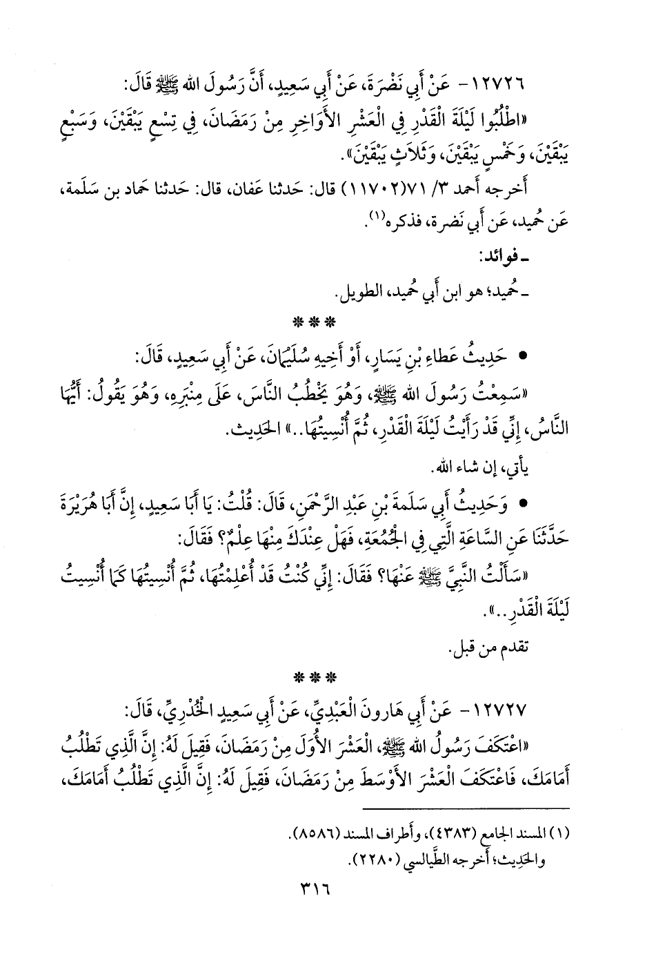 «اطلبوا ليلة القدر في العشر الأواخر من رمضان، في تسع يبقين، وسبع يبقين، وخمس يبقين، وثلاث يبقين».