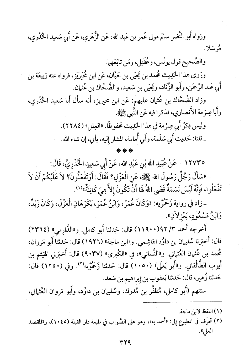 - زاد في رواية زحموية: «وكان عمر، وابن عمر، يكرهان العزل، وكان زيد، وابن مسعود، يعزلان».
