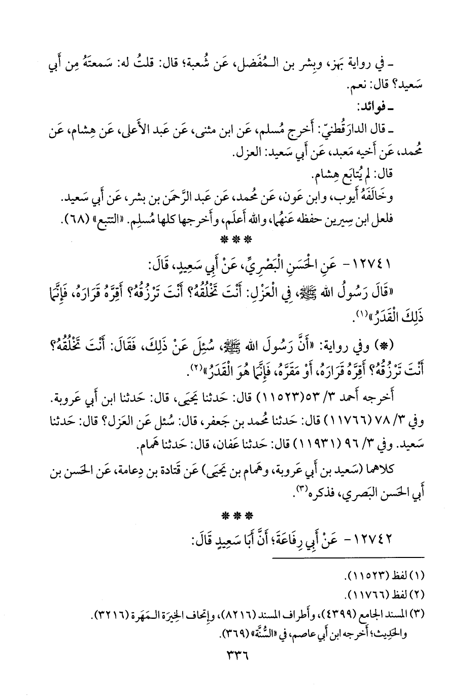 - قال الدارقُطني: أخرج مسلم، عن ابن مثنى، عن عبد الأعلى، عن هشام، عن محمد، عن أخيه معبد، عن أبي سعيد: العزل.