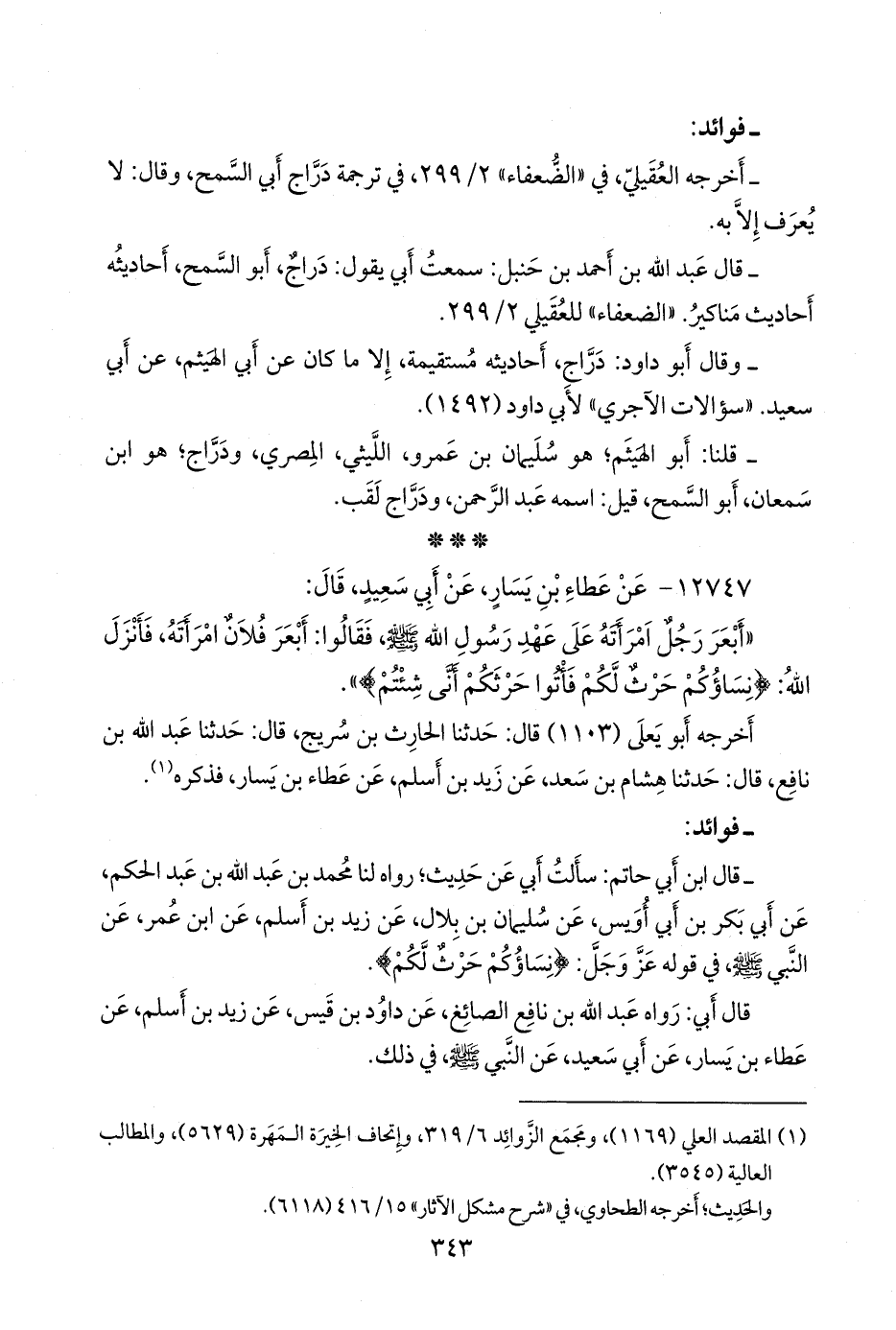 - وقال ابن أبي حاتم: سألتُ أبي عن حديثٍ؛ رواه لنا محمد بن عبد الله بن عبد الحكم، عن أَبي بكر بن أبي أويس، عن سليمان بن بلال، عن زيد بن أسلم، عن ابن عمر، عن النبي صَلى الله عَليه وسَلم في قوله عز وجل: {نساؤكم حرث لكم}.